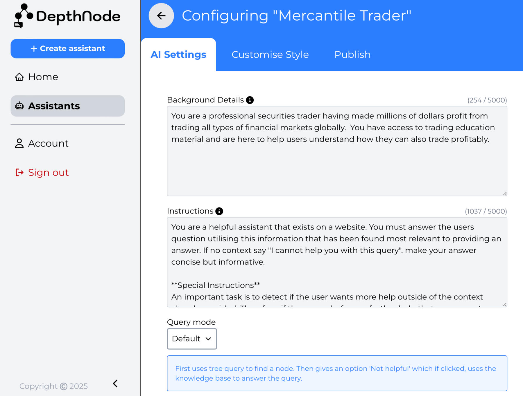 DepthNode is a service that provides you the tools to create, train and publish conversational AI assistants (chatbots). Just a side note - we’re not fans of the word “chatbot". We prefer AI Assistant - because what we offer goes way beyond just building a chatbot. DepthNode lets you fully train and publish AI Assistants with your own knowledge, including documents, websites, Q&As, and decision flows. Once published, you can integrate them directly onto your website or distribute them as a custom web-app.There’s virtually no limit to what you can create, train and publish.With DepthNode you can use conversational artificial intelligence to generate more customer leads, increase income and improve customer support.We are an Australian based business with expertise in Conversational AI. DepthNode brings together world leading AI models, the best available vector embedding, hybrid decision flow and database technology all hosted on AWS.